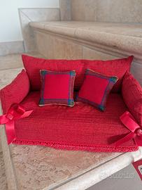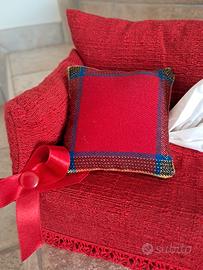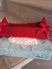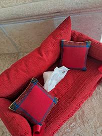 Portafazzoletti rosso a forma di divano. Sotto al divano c'è una scatola di fazzoletti di carta (ne ho messa una mia aperta per far capire meglio, ma poi rimetto la sua scatola ancora chiusa). I fazzoletti vengono estratti tramite l'apertura nel divano. Fatto a mano. Mai utilizzato. Ha anche il cartellino "fatto a mano". Misure base 12×23 cm, altezza 14 cm.