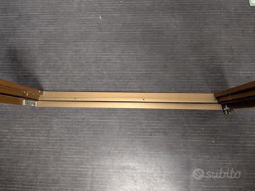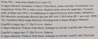 Portafinestra in legno meranti lamellare, finitura tinta noce, con anta normale e a ribalta, maniglietta e fermo per chiusura dall'esterno.