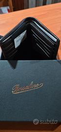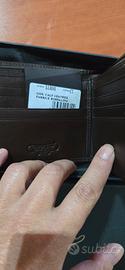 portafoglio Borsalino. presenta un pattern geometrico a contrasto, con toni di marrone e nero, che richiama l'intreccio tipico del marchio Borsalino. Realizzato invera pelledi alta qualità, con finiture curate