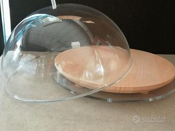 Porta formaggio con cupola alta 14cm e supporto in metracrilato diametro 30cm, tagliere interno in legno diametro 27cm.