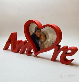 Portafoto decorativo con scritta “Amore” e cuore centrale, ideale come regalo per San Valentino, anniversari o semplicemente per dire “ti voglio bene”.