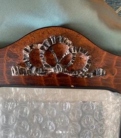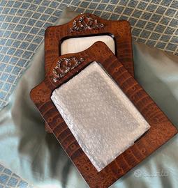 Bellissimo porta foto in radica , originale vintage , con nodo d’amore in alto dai miei nonni definito in “argentone”, sempre appartenuto alla mia famiglia ha una forma molto originale stondata in alto e panno vellutato dietro Questo è predisposto da poggio, ma volendo può essere appeso al muro tramite gancetti Ne ho due, sono sempre stati vicini su un mobile antico e li vendo preferibilmente insieme Le dimensioni sono 20 x 28 cm nella parte più alta e hanno uno spessore di 2,5 cm La bellezza la si nota e anche la particolarità degli oggetti oggi introvabili, oltre alla preziosità del legno si aggiunge quella del metallo Prezzo per ciascuno 21 €, per chi li prende entrambe 37 Indico buone condizioni, giusto per l’età che hanno, ma in realtà non vedo difetti evidenti tranne un minimo di patina di antico Bellissimi su piano in marmo con svuota tasche in radica di altro annuncio Possibilità di fare il set ( V .ultima foto )