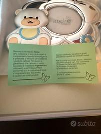 portafoto sagomato Atelier Baby con orsetto, realizzato in metallo argentato (o bilaminato in argento).