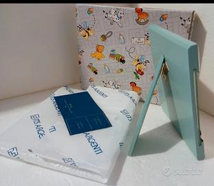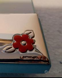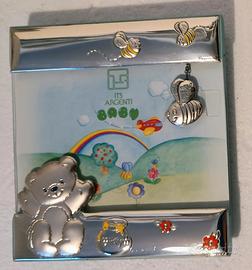 Cornice portafoto, da tavolo, della ITS Argenti, in argento laminato, vivacizzato con alcuni tocchi di smalto rosso e giallo e decorato con un simpatico orsetto, un vasetto di miele e tre apine di cui una si "dondolerà" sopra la futura foto. Retro azzurro. Ottimo stato, mai usato. Venduto con la sua confezione originale, la federa protettiva e il certificato di garanzia. Misure esterne: 13 cm x 14 cm Misure interne: 13 cm x 8,4 cm Peso, imballaggio incluso: 0, 500 kg circa