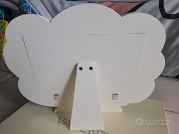 portafoto in argento e retro in legno albero della vita .Valenti & co.cornice portafoto multipla da bambino formato da 5 portafoto a forma di mela arricchite intorno da uccellini e rami con parti di colore celeste a formare L' ALBERO DELLA VITA . Misure della cornice 25x32 .Misure interne delle 5 foto formato 5x7