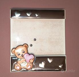 Portafoto in argento marca Valenti con orsetto rosa, dimensioni 15,5 (l) x 17 (h) cm, retro in legno.