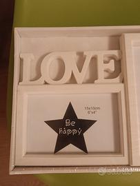 Portafoto in legno bianco con scritta love e 4 portafoto: due orizzontali 15 x 10 e 12,5 x 8,75 uno verticale 13 X 18 e uno a forma di cuore 8,75 x 8,75