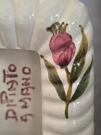 Delicato portafoto in ceramica bianca, con un motivo floreale dipinto a mano. La cornice presenta una lavorazione a coste che le conferisce un aspetto elegante.