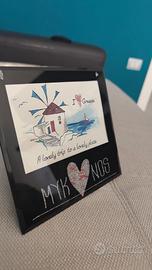 Vendo portafoto souvenir da Mykonos (Grecia), con decorazioni glitterate e scritta “I love Greece – A lovely trip to a lovely place”. Realizzato in materiale rigido con finitura lucida nera e dettagli argentati e rossi a effetto brillante