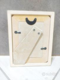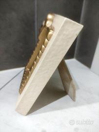 Portafoto THUN in ceramica con fiocco dorato, originale THUN, da collezione (fuori produzione). Adatto a formato di foto cm 10x15. Fronte in ceramica (con vetro centrale) e retro rivestito in tessuto simil velluto (tutte le parti sono originali THUN). Dimensioni del profilo esterno dell'oggetto: cm 13,5 x h 17. Profondità della cornice: cm 3,00. Peso: 525 grammi. Disponibile alla spedizione (spese spedizione a carico dell'acquirente).