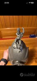 Splendido centrotavola / portafrutta in peltro 95% lavorato a mano, produzione italiana (marchiato “PELTRO 95% – LAVORAZIONE A MANO – MADE IN ITALY”).
