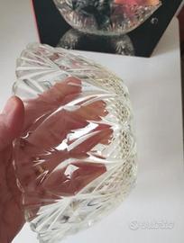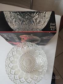 L'oggetto si presenta in condizioni impeccabili, mai usato, completo della sua confezione originale. La lavorazione del vetro crea un motivo geometrico a diamante che riflette la luce in modo elegante, rendendolo perfetto sia come centrotavola che per servire frutta o dolci.