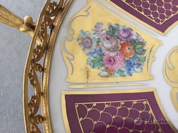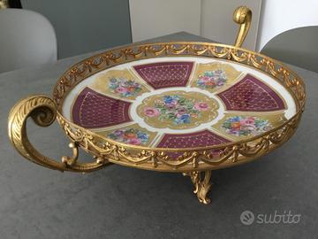 Portafrutta in ceramica con decoro floreale, su supporto in lega di alluminio. Buono stato di conservazione, vorrei che avesse una seconda vita.