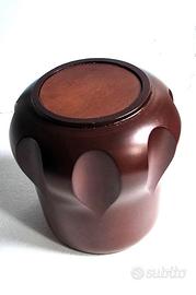 Realizzato in legno tornito (mogano africano o essenza tropicale affine, tipo sapele), con rivestimento interno in rame, bordo in acciaio e coperchio in metallo con pomello.