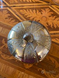 Elegante portaghiaccio vintage in silver plate con raffinata lavorazione decorativa a motivi floreali e forma a zucca. Completo di coperchio originale.