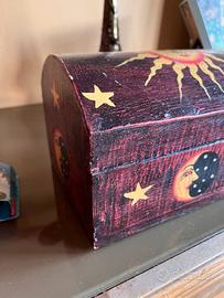 Portagioie ampio in legno anticato dipinto a mano, come da foto l'interno è molto ampio e il coperchio ricurvo ne aumenta la capacità.