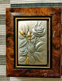 Sul coperchio è incastonata una placca sbalzata realizzata in argento 925. Il motivo raffigurato è un delicato tema floreale con rose, tipico della produzione artistica italiana degli anni '80 e '90.