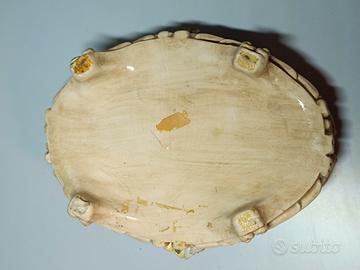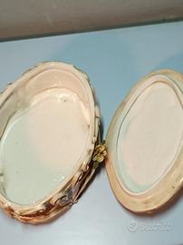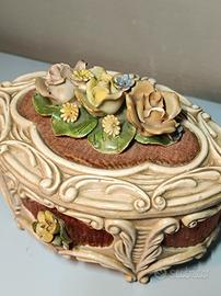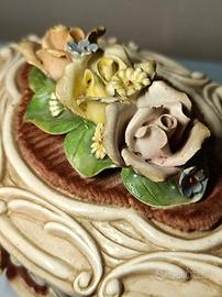 Propongo raffinata scatola portagioie in Ceramica Artistica di Bassano anni 60/70, un pezzo da collezione che unisce la maestria della ceramica veneta a dettagli tessili eleganti. Caratteristiche: Il coperchio e i lati sono decorati con inserti in velluto marrone originale dell'epoca. Decorazione Floreale: Sul coperchio è presente un ricco bouquet di rose e fiori modellati a mano. Interno: Spazioso e rifinito, ideale per custodire anelli, collane o piccoli ricordi preziosi. L'oggetto è in ottime condizioni e il tessuto è integro Per ulteriori foto e informazioni non esitate a contattarmi