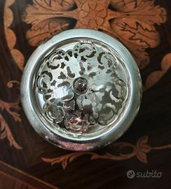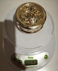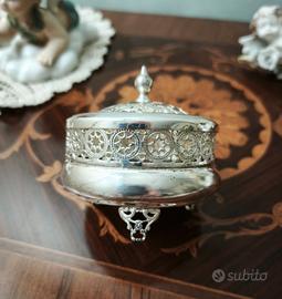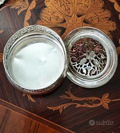Scatola finemente cesellata portagioie o portaoggetti in argento 925. Stile: Design vintage (anni '60) con elaborata lavorazione a traforo e motivi floreali. Peso: 47 grammi. Come nuova, nonostante l'età, senza imperfezioni.