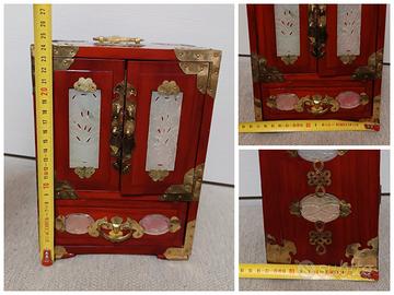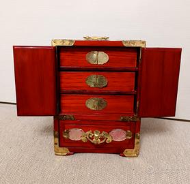Mobiletto tipico anni 80-90 in legno laccato dalla tonalità rossiccia con cassettini rivestiti in seta di colore rosso. 4 cassetti totali.