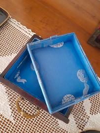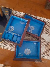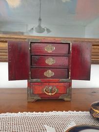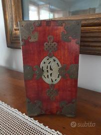 Splendido portagioie vintage anni 50, pezzo di artigianato orientale in legno di palissandro, giada e ottone. Sulle ante frontali 2 lastre di giada intagliata a mano in immagini di fiori di loto in vaso, su ogni lato un medaglione di giada intagliata in fiore e foglia. Tutte la giada è circondata da elementi in ottone inciso a mano,sui lati simboli del doppio infinito tibetano. Sugli angoli della box ci sono rinforzi in ottone inciso delicatamente a mano con farfalle in volo. Le maniglie frontali sono a forma di anfore (simbolo di abbondanza)in ottone inciso. La maniglia superiore presenta il simbolo della doppia fortuna Shuangxi. La maniglia è circondata da ottone con inciso piccoli pipistrelli portafortuna. Anche gli angoli della box sono in ottone inciso con piccoli pipistrelli, portavano fortuna nell'antica Cina. Dietro le ante ci sono 3 cassetti rivestiti di seta azzurra con disegni orientali portafortuna e un cassetto in basso con doppio fondo. Conserva il lucchetto cinese originale a monoblocco in ottone. Una meravigliosa aggiunta di gusto orientale ed esotico per la casa, o un regalo elegante per una donna. Pezzo artigianale numerato sotto (1