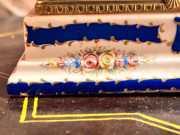 Portagioie cofanetto porcellana di Limoges, Francia, dipinto a mano con la decorazione "Vigen" e firmato ACF. Splendido cofanetto portagioie in pregiata porcellana di Limoges, firmato dal rinomato atelier A.C.F. (Atelier de Cuisson de France). L'oggetto presenta il classico ed elegantissimo decoro "Vieux Limoges". • Lavorazione: Interamente dipinto a mano (Fait à la main), come certificato dal marchio sul fondo. • Dettagli di pregio: Raffinate decorazioni floreali policrome e bordature in Blu Cobalto. • Finiture: Ricchi fregi e rifiniture realizzati probabilmente (non verificato ) in Oro Zecchino applicato a terzo fuoco oppure in ottone dorato . • Montatura: Struttura dorata con chiusura a clip perfettamente funzionante a forma di conchiglia. • Stato: Eccellenti condizioni vintage. Nessuna sbeccatura, filatura o perdita di doratura evidente. • Dimensioni: circa 13×9×6 cm. vintage.