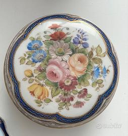 Vendo tre preziosi oggetti in porcellana: 1. Contenitore con coperchio, in porcellana dipinta a mano con immagine floreale e damascature in oro, marcato Heinrich Germany, diametro 11 cm; 2. Scatolina con coperchio, in porcellana dipinta a mano con immagine floreale, diametro 5,5 cm; 3. Piattino in ceramica tedesca con innamorati, lungh. 8 cm.