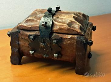 Si tratta di un portagioie in legno e finiture in metallo e chiodi a vista, dal sapore un po' "medioevalistico". E' ancora in discrete condizioni: solo il coperchio appare un po' "provato", ma una mano di olio basterebbe per ridargli smalto. Ma anche così, ha il suo fascino da "finto anticato". Dimensioni 14X10X9