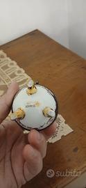 Questo oggetto è unportagioie a forma di uovo in porcellanadecorato in stile Fabergé, con motivi floreali, dettagli dorati e piedini in ottone.