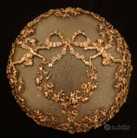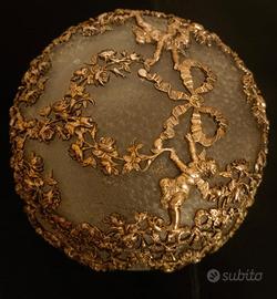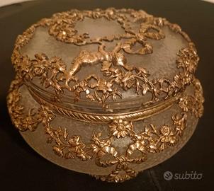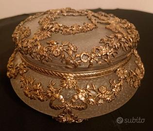 Offro in vendita un elegante e raffinato portagioie in vetro inciso con decorazioni in argento di ghirlande, fiori, fiocchi e angeli finemente cesellati. L'oggetto è alto cm 8 con un diametro di cm 10 ca. Prezzo trattabile.