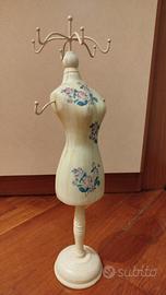 Delizioso portagioie vintage a forma di manichino, in stile shabby chic. Realizzato in legno dipinto color crema, con decori floreali e ganci metallici per appendere collane, bracciali e anelli.