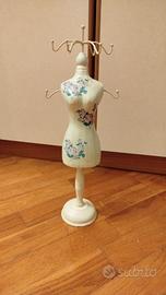 Delizioso portagioie vintage a forma di manichino, in stile shabby chic. Realizzato in legno dipinto color crema, con decori floreali e ganci metallici per appendere collane, bracciali e anelli.