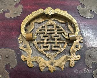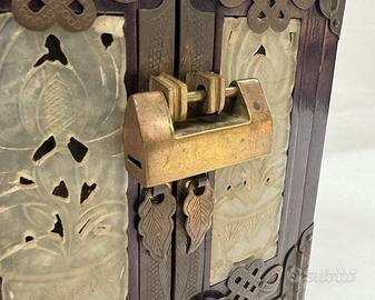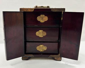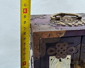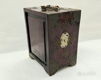 Portagioie orientale in legno con lucchetto, dettagli in metallo e inserti in giada con tre cassettini foderati in tessuto. Ottima fattura e tenuto benissimo. Misure in foto.