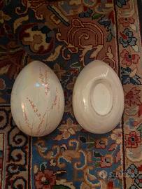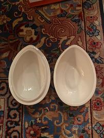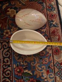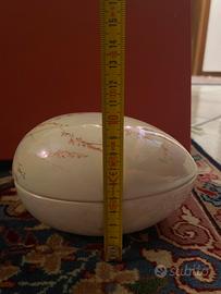 Portagioie ovale di colore bianco con dettagli di fiori marrone e rosa. Misure: 10 cm altezza x 15 di lunghezza Materiale: ceramica