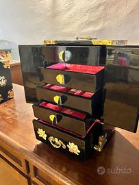 Si tratta di un portagioie cinese vintage in legno laccato, con intarsi in madreperla e raccordi in metallo dorato. Presenta due ante che si aprono per rivelare cassetti o scomparti interni.