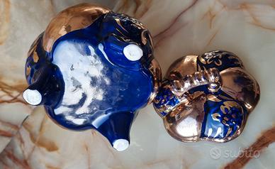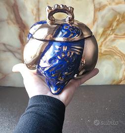 Portagioie scatola vintage italiano in ceramica blu cobalto con rilievi dorati su piedini scolpiti, anni '50-'60.