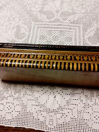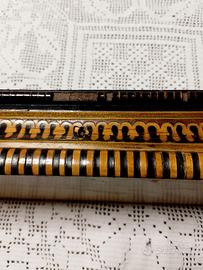 Antico portagioie finemente intarsiato con figure floreali e personaggi . Sprovvisto di chiave ma cerniere in perfetta funzionalità . Oggetto squisitamente artigianale. Manufatto fine 800. Pezzo unico.