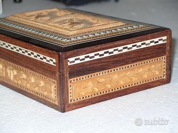 Scatola portagioie stile Egizio - orientale con inserti in legno intarsiato con scene naturistiche e finissimi micro-mosaici decorativi, in eccellenti condizioni estetiche.