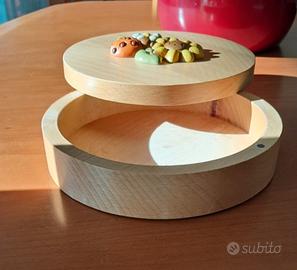 Portagioie Thun cilindrico in legno, apertura a scorrimento, con placchetta decorativa in ceramica dipinta. Disponibile per la spedizione, ma privo dell'imballo originale.