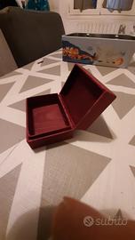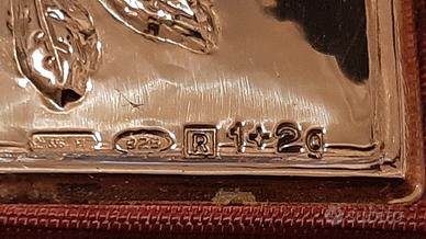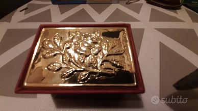 Portagioie vintage di produzione artigianale italiana. Probabilmente degli anni 80. La cassa è in legno rivestito in tessuto di raso bordeaux. Sul coperchio, incardinato alla base, è applicata una placca in argento Sterling 925 (vedi punzonatura), rappresentante una rosa completa di ramo e foglie. La chiusura è a incastro con la base. Dimensioni 6,3x4,4x3 cm e peso di 40 gr. Condizioni perfette. Come nuovo!!!!