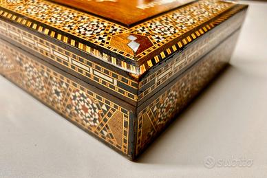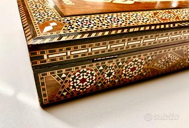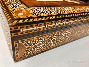 Portagioie in legno intarsiato a mosaico provenienza: Giordania anni '70 cassa in mogano intarsi a mosaico in osso, madre perla, ebano, lacca rossa intarsiato anche l'interno del coperchio interno foderato rosso