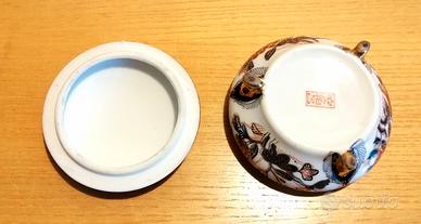 Splendido, piccolo partagioie rotondo, vintage, in fine porcellana giapponese, mi è stato regalato negli anni '70, ma la sua realizzazione potrebbe essere di molto precedente. La decorazione di sviluppa sul coperchio e nella fascia laterale con i colori rosso mattone, nero, verde e oro su base bianca. Lateralmente si notano tre decorazioni floreali diverse. Il portagioie è sostenuto da tre eleganti piedini. Sul fondo è stampato il marchio. È in condizioni perfette. Oggetto di alto valore artistico, per amanti di questa arte, collezionisti o, semplicemente, per chi ama l'armonia in tutte le sue forme.