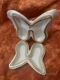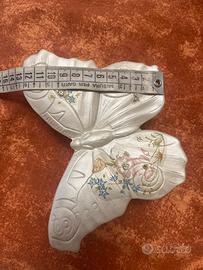 Contenitore per anelli a farfalla che fa da soprammobile; manca una pietra.Nella parte più ampia le ali misurano 16 cm circa; nella parte piu stretta misura 10 cm. Leggermente scollato ma con una buona colla funzionante. Perfetto nelle cerniere di apertura e chiusura. Si può utilizzare