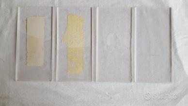 Portalistino da muro in plexiglass trasparente, costituiti da una lastra in metacrilato trasparente piegata verticalmente in due. I portalistini per la maggior parte sono in ottime condizioni, senza ingiallimenti, graffi o righe rilevanti, specie nel lato a vista. Sul lato interno, nella parte a muro, tutti i portalistini presentano residui di biadesivo.