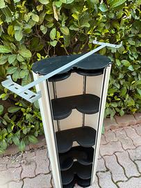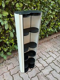 decoma design, 1991 Contenitore a muro per cd o multiuso con struttura in alluminio estruso anodizzato. Ha altre componenti in abs nero. I piani sono regolabili in altezza. Staffa a muro inclusa Dimensioni: cm.33x17x101h