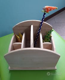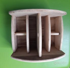Portaoggetti in legno naturale, girevole, con 6 scomparti di misure diverse. Nuovi, mai usati. Disponibili due identici. Il prezzo è da riferirsi ad uno solo.