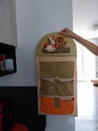 Portaoggetti da parete firmato THUN, con decorazione in rilievo raffigurante un coniglietto tra fiori. Dotato di cinque tasche in tessuto (quattro verdi e una arancione), perfette per organizzare piccoli oggetti in cucina, bagno o cameretta.