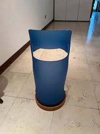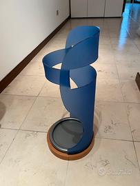 Elegante portaombrelli dal design contemporaneo, caratterizzato da linee sinuose e struttura aperta in materiale plastico resistente color blu satinato. La base circolare in legno con vaschetta raccogli-acqua removibile garantisce stabilità e praticità, proteggendo il pavimento da gocce e umidità.