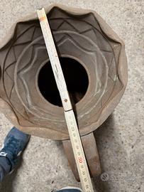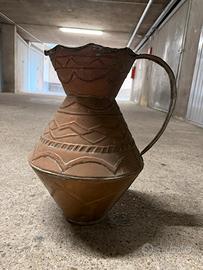 brocca in rame decorata, stile artigianale/vintage, ideale come oggetto d’arredo, porta ombrelli, portafiori o complemento per ambienti rustici, cantine, taverne o case di campagna. La brocca presenta decorazioni incise su tutta la superficie e un manico laterale robusto. Da lucidare ma in buonissime condizioni.
