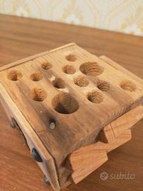 Portapenne artigianale realizzato assemblando parti in legno provenienti da materiali di recupero + inserti in metallo.